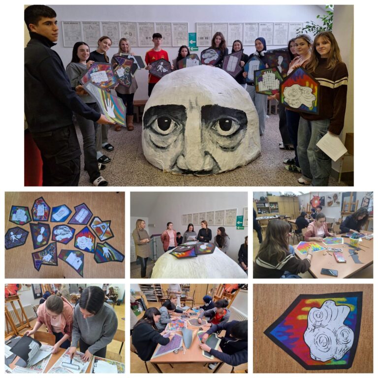 Ve škole jsme pak pracovali v literárním a výtvarném workshopu. E. A. Poe položil základy detektivního žánru a stvořil také typ chytrého a pozorného detektiva, který řeší případy díky dedukci a všímavosti ke stopám. Studenti nejprve losovali slova, která potom použili ve svém vlastním detektivním příběhu. Některá tato slova v příběhu potom hrála klíčovou roli jako indicie v rozuzlení zápletky. Do výtvarné části projektu byli zapojeni i studenti několika výtvarných skupin naší školy. Pro projekt předem vytvořili velký objekt „vystupující hlavy E. A. Poea“ Na tento objekt poté projektoví studenti vytvářeli mozaiku – myšlenkovou mapu tří nových autorských detektivních příběhů. Studenti si vyzkoušeli techniku malby suchými křídami a linorytu. Výtvarná práce byla inspirována mozaikami v parku Güell velkého katalánského architekta Antoni Gaudího. Objekt ještě není zcela hotov, je potřeba nalepit mozaiku na spisovatelovu hlavu. 🙂 Ale již brzy ho budete moci vidět v prostorách školy. Myslíme si svorně, že se náš projekt povedl.